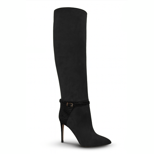 Schlanker, röhrenförmiger Stiefel aus Wildleder mit Krokodillederriemen. Pfennigabsatz in 80mm, 100mm oder 120mm