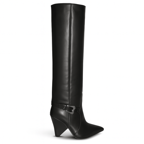 Botte tubulaire à bout effilé en cuir véritable avec bride et boucle, talon moyen conique de 90mm