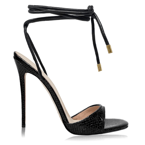 Sandalo a punta tonda laminato  pitonato con lacci alla caviglia, tacco a spillo da 100mm o 120mm