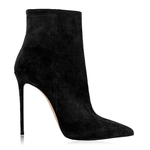 Stivaletto a punta sfilata in vero camoscio con zip interna e tacco a spillo 100mm o 120mm