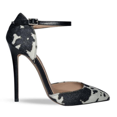 Sandalo a punta chiusa in stampa mucca con cinturino alla caviglia regolabile, tacco a spillo da 80mm, 100mm o 120mm