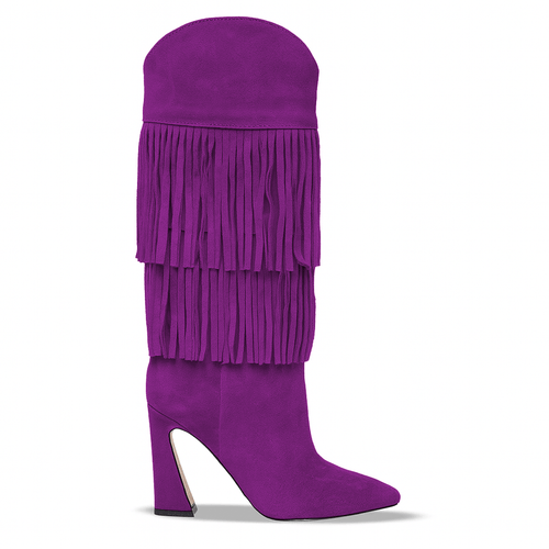 Tubular boot with pointed toe in suede with fringes and 90mm heel