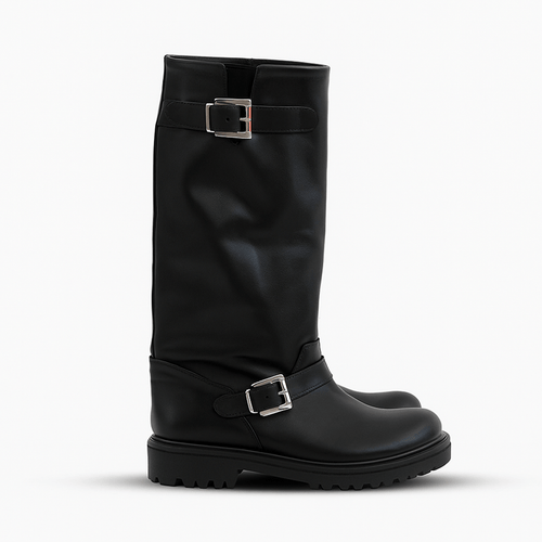 Genuine leather ankle boot with double buckle, round toe, and tank tread rubber sole with internal zipper
