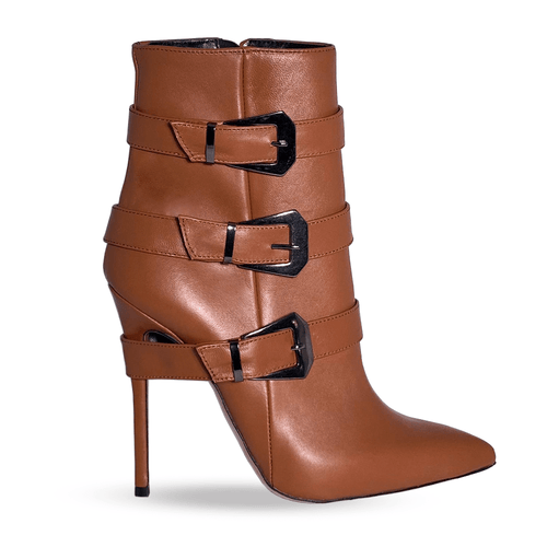 Genuine leather pointed toe ankle boot with 3 side buckles and 100mm or 120mm stiletto heel